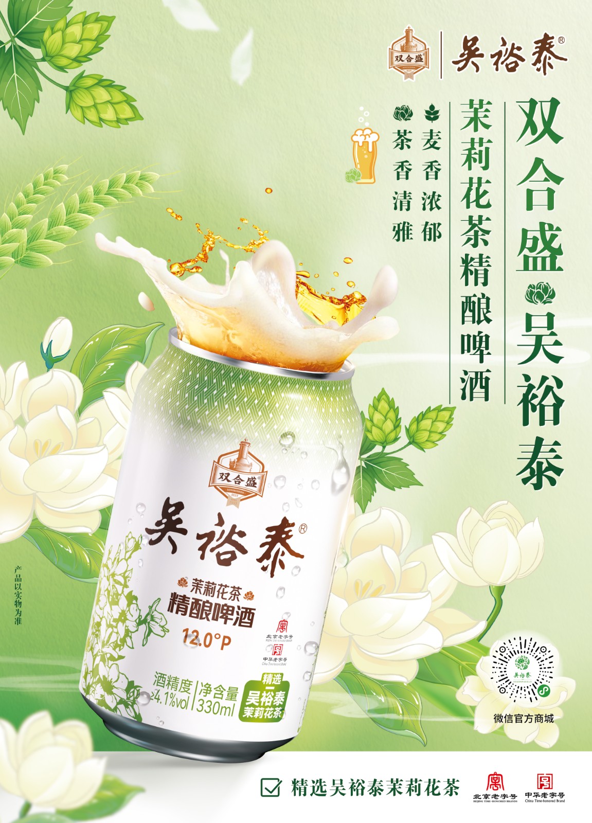茶+酒=王炸CP!吴裕泰与双合盛两大百年老字号跨界携手,创新打造茉莉花茶精酿啤酒,首次亮相引热全场!茶韵与酒香巧妙融合,开盖瞬间香韵扑鼻而来,茶香入酒,层层绽放,尽显东方雅韵!