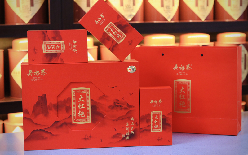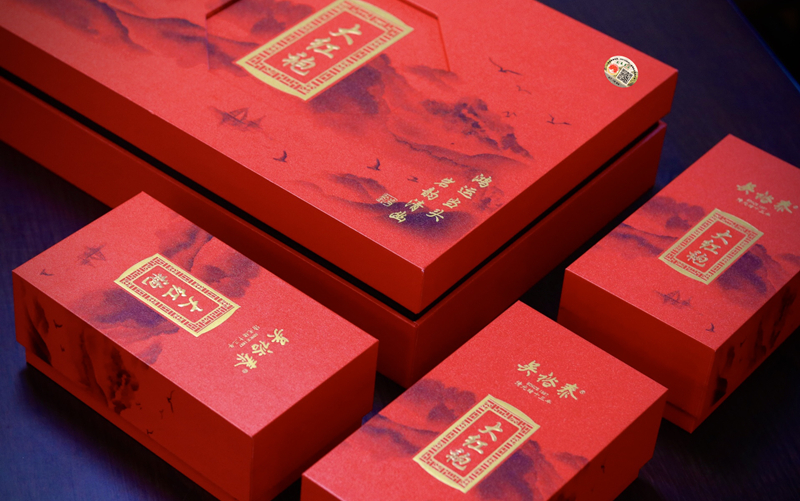 该礼盒设计灵感来源于大红袍茶叶产地——福建省武夷山园区,其优美秀丽的自然生态,孕育了大红袍独一无二的香气和滋味。设计融合了武夷山之俊朗的山、浓情的水,其中勾勒出武夷山园区极具代表的山峰【玉女峰】的外形轮廓,屹立于山水之间。设计运用【中国传统水墨画】的艺术形式展现,将茶香与书画香完美融合“二香合一”,彰显景观意象之美感,凸显品牌文化之底蕴。
