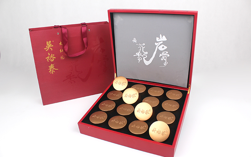 岩骨花香大红袍礼盒原料特选自武夷岩茶精华地带,经精心烘焙,加工后形成了武夷岩茶独有的岩骨花香品质特征。茶叶条索紧结、肥壮圆直,色泽乌黑润泽,冲泡后滋味醇厚,“岩韵”显著,香气纯和持久,汤色橙红明亮,杯底有余香。礼盒外盒为亚光漆盒,雅致大气,内配16个小罐,方便携带饮用。